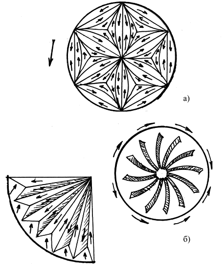 Рис. 35. Эскизы для контурной резьбы: а – выполняемой стамеской-косяком; б – выполняемой полукруглыми стамесками: стрелки показывают порядок выполнения и направление резьбы