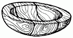 Для начала необходимо нанести на брусок легкими линиями контуры будущей тарелки. Затем закрепить заготовку на планшайбе и выбрать с вращающейся болванки внутреннюю древесину, сделав небольшое углубление. Тонкой стружкой снимают с заготовки лишнюю древесину, придав правильные очертания тарелке.